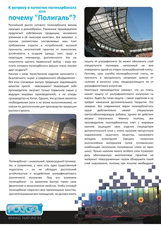 Поликарбонат устойчив к ультрафиолетовому излучению, перепадам температур, влаге и другим атмосферным явлениям